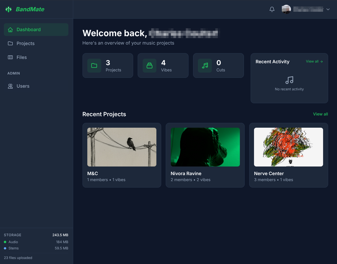 Organize your music into a natural hierarchy. Projects hold your band's work, Vibes group songs by mood or theme, and Cuts are your individual tracks.